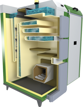 У традиційній камері спалювання застосовано додатковий вентилятор, що дозволяє отримати оптимальні параметри спалювання традиційного палива та утримання заданої температури. Завдяки додатковому вентилятору при повному заповненні камери отримуємо стабільне згорання, а також можливість використання не тільки кам’яного вугілля, а й вугільного пилу.